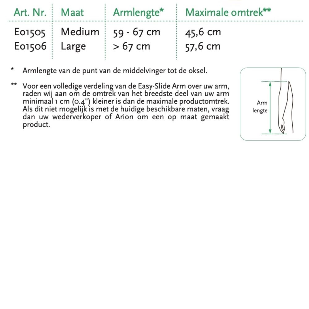 Zij hoeven alleen het hulpmiddel over de arm aan te brengen en de medische compressiekous over het hulpmiddel te schuiven. Arion Easy-Slide Arm maakt het voor dragers van armkousen mogelijk om armkousen gemakkelijk en zelfstandig aan te trekken.