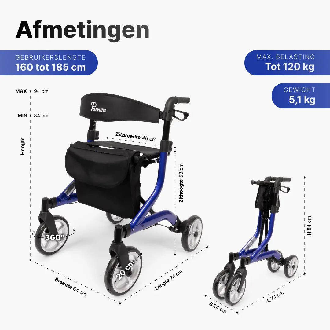 De Parvum Rollator SuperLight in een stijlvolle blauwe kleur biedt ongeรซvenaard comfort en ondersteuning voor iedereen die zijn of haar mobiliteit wil verbeteren. Deze lichtgewicht rollator is perfect voor zowel binnen- als buitengebruik, waardoor je vrij en zelfstandig kunt bewegen.