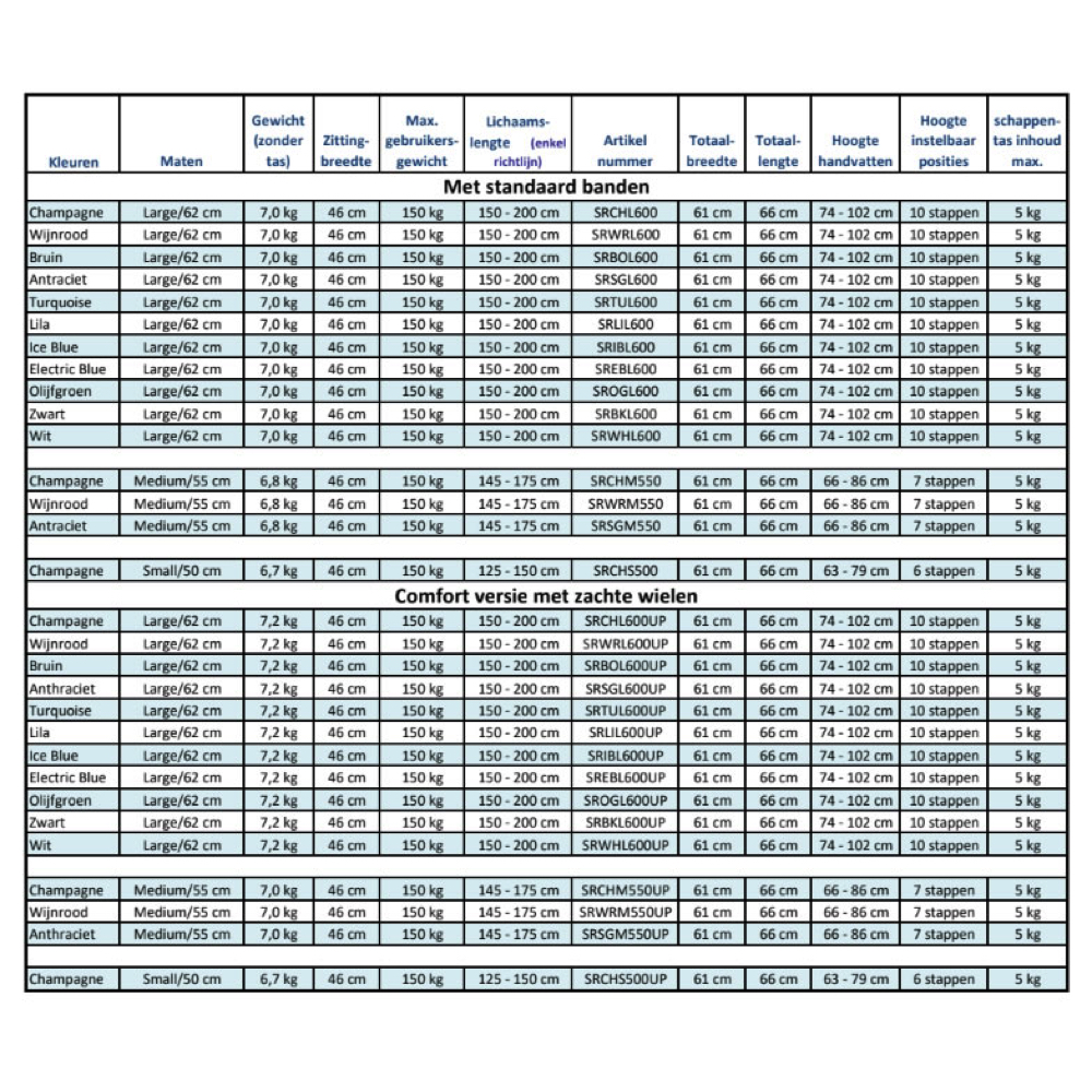 De handgrepen zijn soepel in hoogte te verstellen vanaf 60 cm bij de lage tot 102 cm voor de hoge versie.