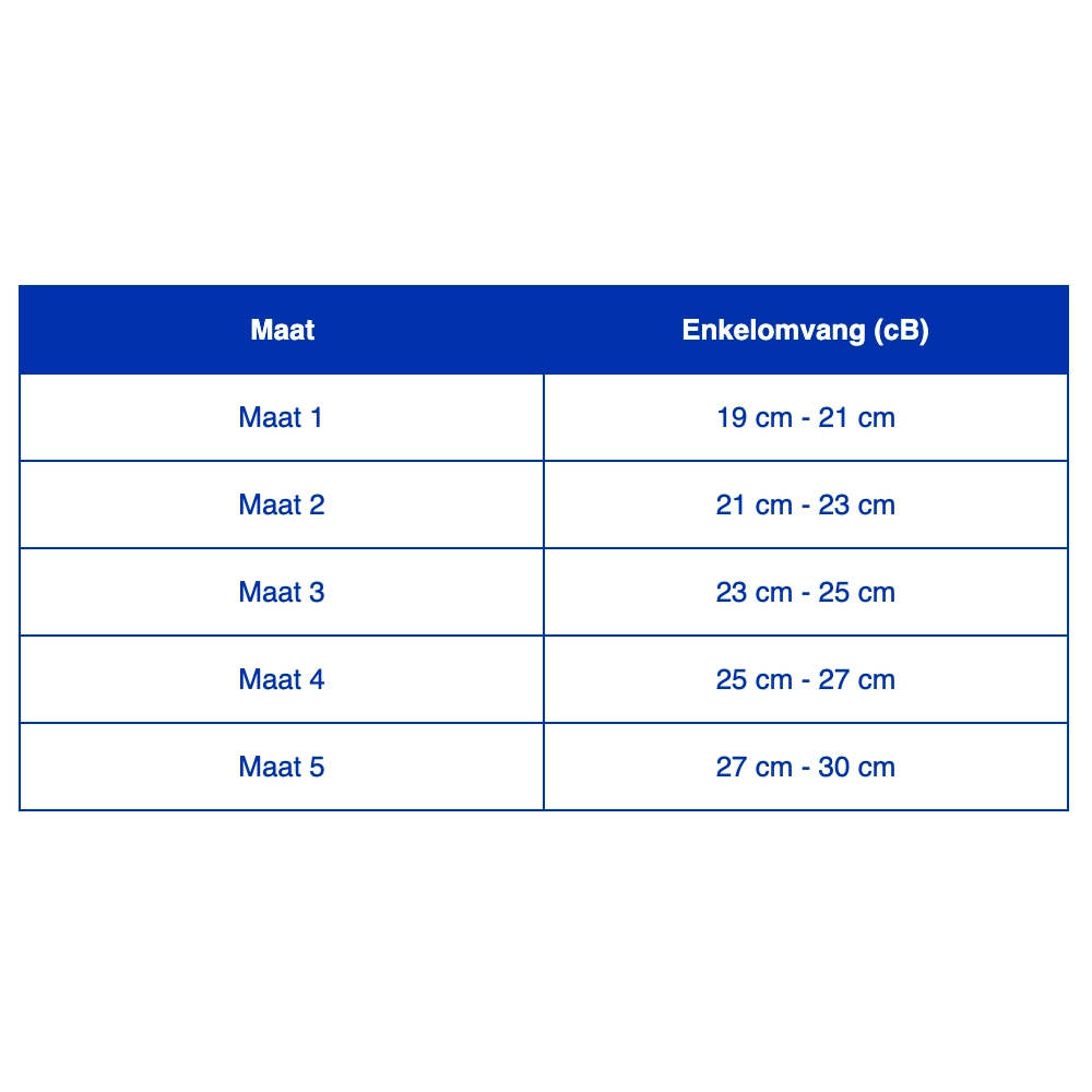 Maattabel:ย Meet de omtrek van de enkel (cB) op het smalste punt boven het enkelbot om de juiste maat te bepalen.