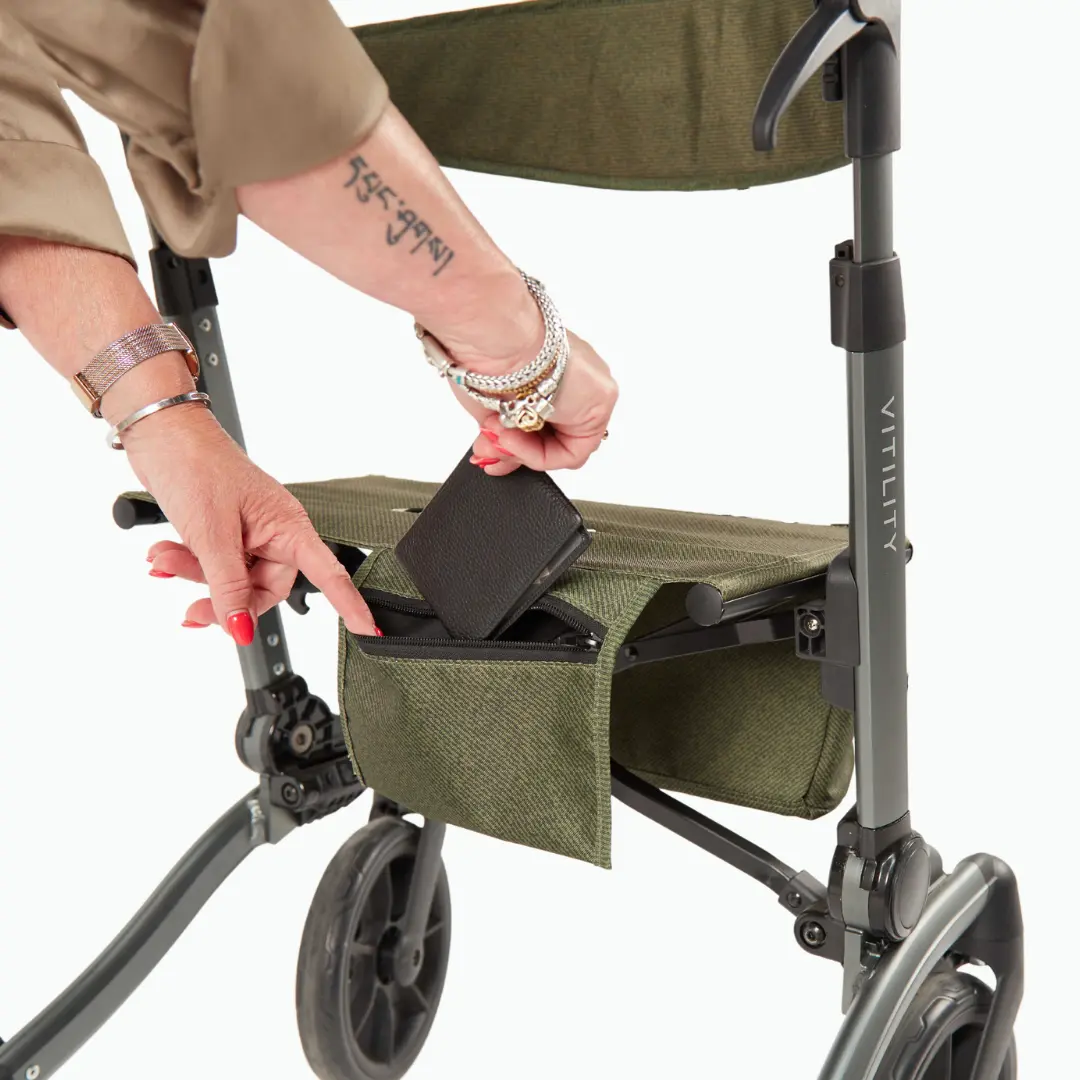 De compactheid van de Vitility rollator is te danken aan het dubbel opvouwbare systeem, wat een groot voordeel is bij beperkte opbergruimte in huis of in de auto! De rollator is uitgerust met een zachte zitting, rugleuning en ergonomisch gevormde handgrepen voor een betere grip en extra comfort. Bovendien is deze voorzien van parkeer- en handremmen, waarbij je de remmen handmatig kunt afstellen. De remkabels zijn netjes weggewerkt in het frame, wat niet alleen het uiterlijk van het product verbetert, maar ook zorgt voor veiligheid door het voorkomen van losse remkabels waar je aan kunt blijven haken. Daarnaast kun je de hoogte van de Vitility rollator aanpassen aan jouw wensen. Verander de hoogte van de rollator binnen enkele ogenblikken met behulp van 3 standen! Onder de zitting bevindt zich een grote tas voor het veilig opbergen van spullen en een tasje waarin een kleiner formaat portefeuille past. Deze tassen zijn bevestigd aan de rollator en kunnen worden afgesloten met een rits om diefstal te voorkomen. De speciale zachte anti-lek wielen bieden uitstekende grip zowel buitenshuis als binnenshuis.